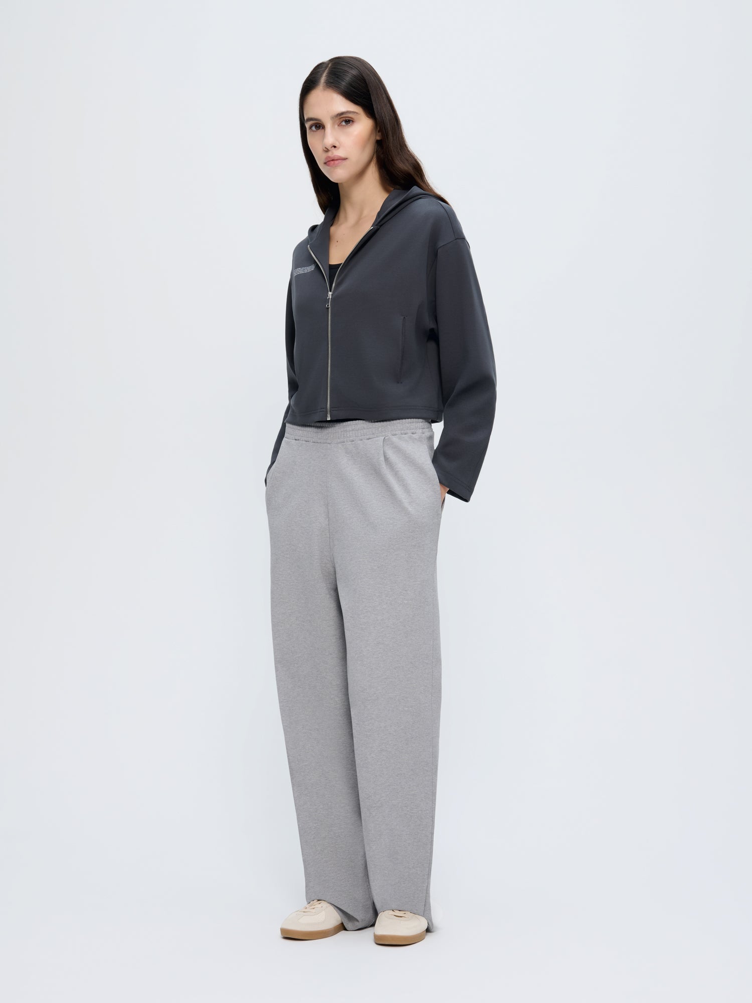 Layers you return to. Expertly crafted from 45% OCS-certified organic cotton, 45% GRS-certified recycled cotton, and 10% Elastane Creora®, the Double Jersey Cropped Zip Up Hoodie in smoked black offers an ultra-soft feel and a cropped fit. Designed for daily rituals, this just-landed athleisure wear staple was treated with PPRMINT™ oil to help keep it fresher for longer.